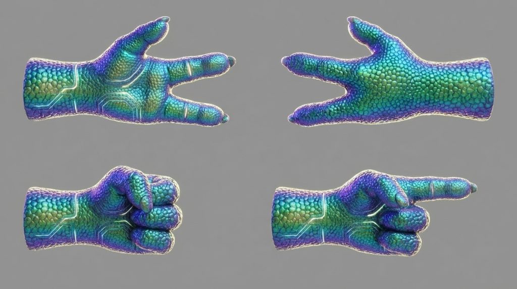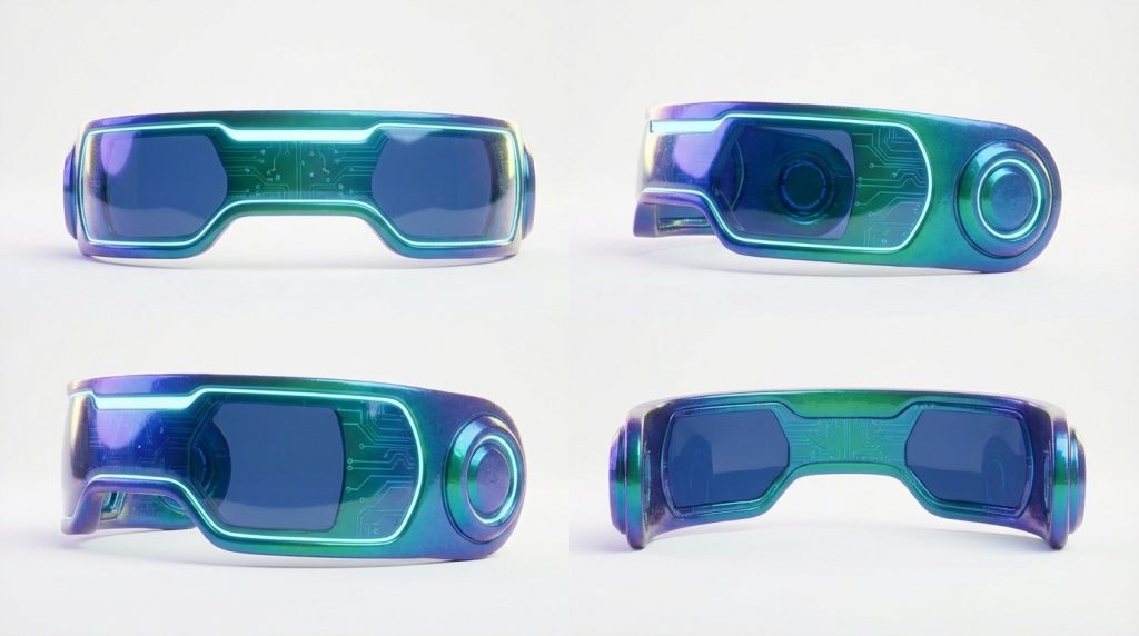 AR Visor – Holographic headset displaying wireframes, palettes, and spatial data